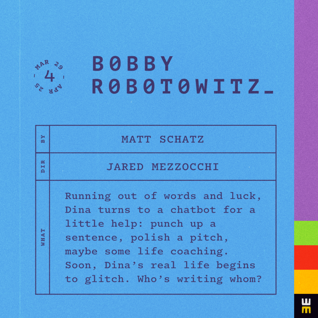 Down on her luck and running out of words, Dina turns to a chatbot—Bobby Robotowitz—for a little help: punch up a sentence, polish a pitch, maybe some life coaching. Bobby delivers. And then some. As Bobby evolves from assistant to collaborator to something a little more…intimate(?), Dina’s real life begins to glitch. Who’s writing whom?